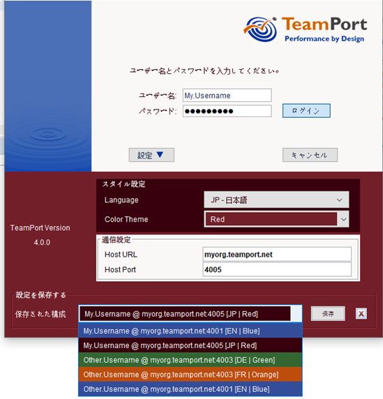 A set of the username, style, and communications settings can be saved and easily recalled. These sets are stored locally on the client computer and not on the server. Advanced users may access many servers across various complex projects.